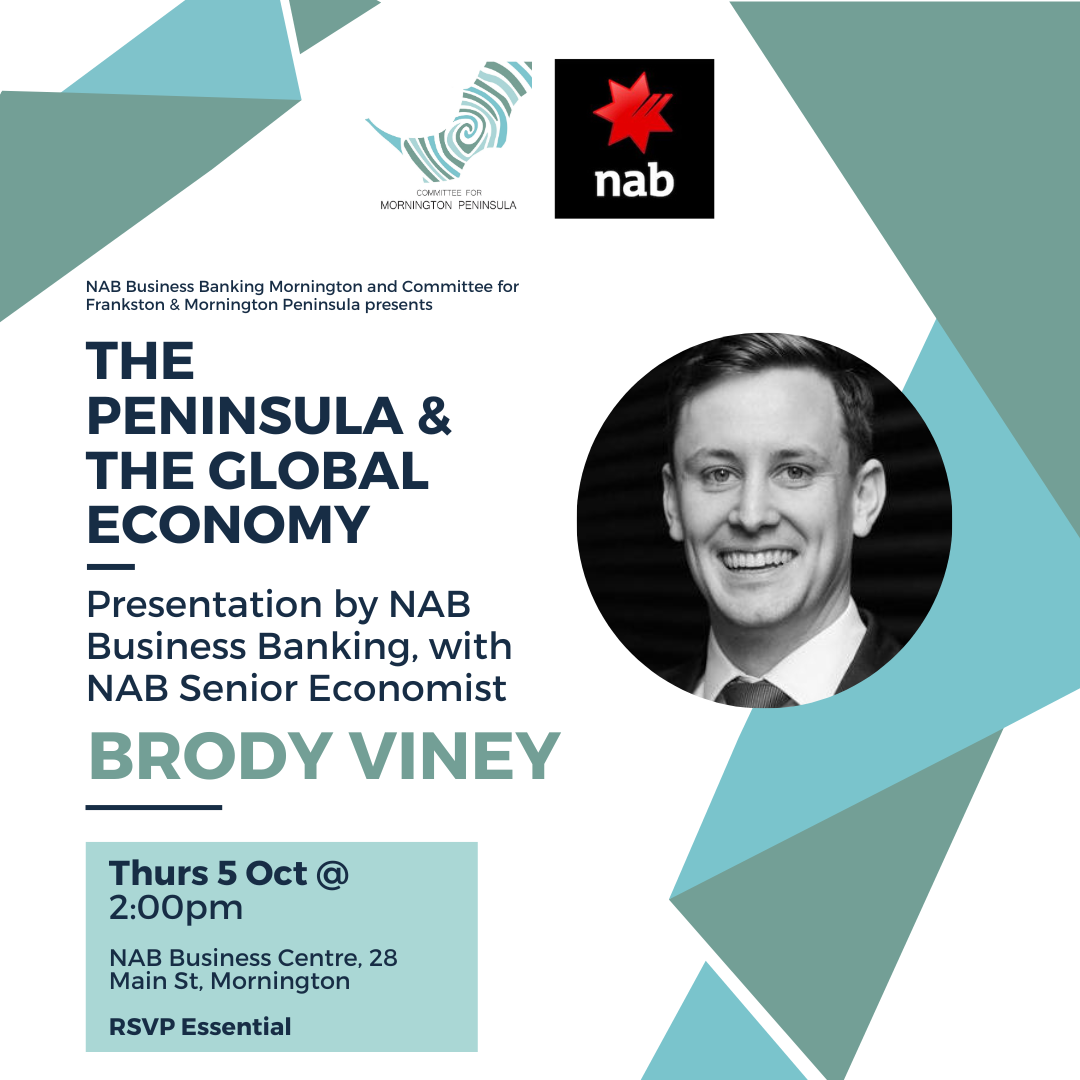 Presented by NAB Business Banking Mornington, the Committee for Frankston & Mornington Peninsula invite you to attend an afternoon briefing with NAB Senior Economist Brody Viney where Brody will share his insights and provide an update on the global, Australian & local Frankston & Mornington Peninsula economy.