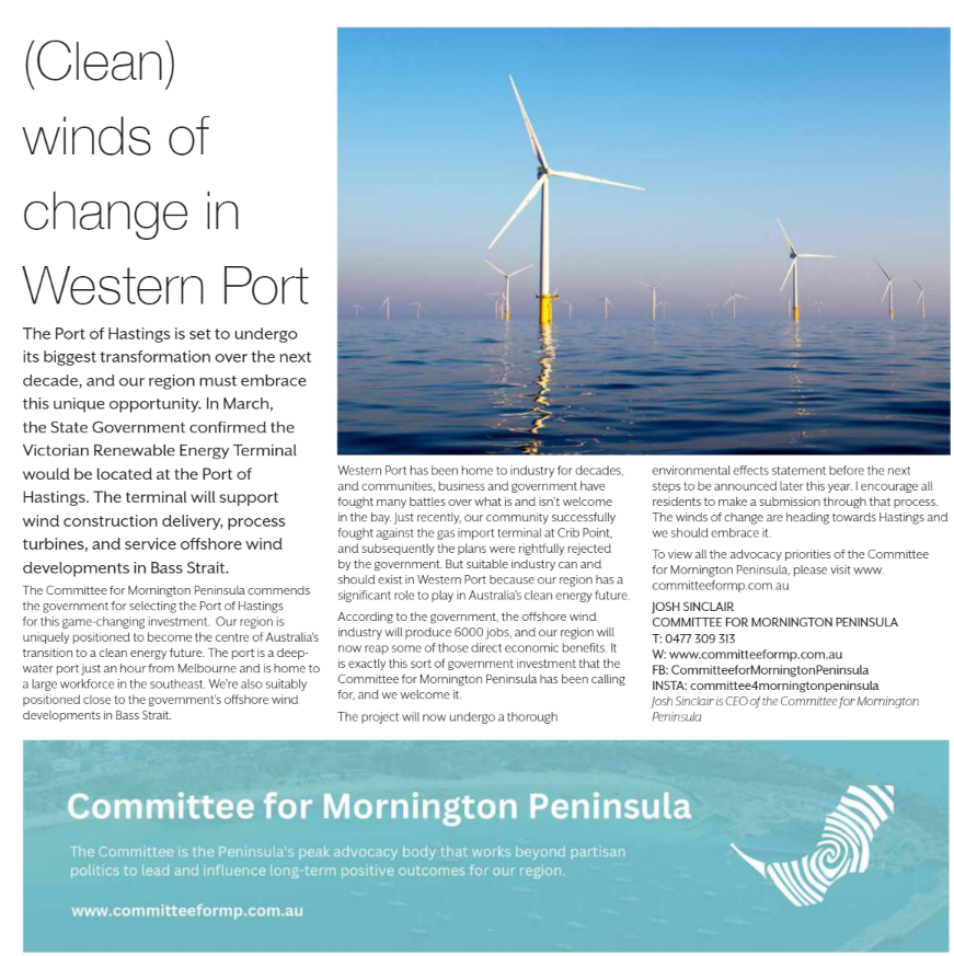According to the Government, the offshore wind industry will produce 6000 jobs, and our region will now reap some of those direct economic benefits. It is exactly this sort of Government investment that the Committee for Mornington Peninsula has been calling for, and we welcome it.
