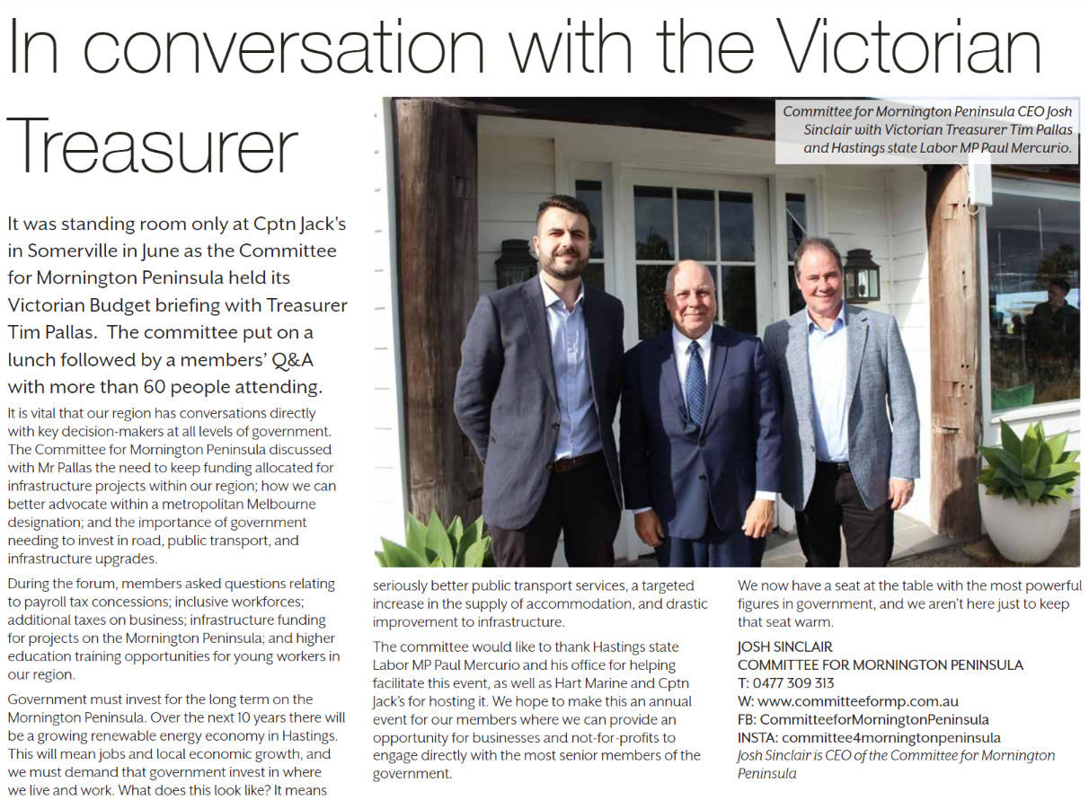 It was standing room only at Cptn Jack’s in Somerville in June as the Committee for Mornington Peninsula held its Victorian Budget briefing with Treasurer Tim Pallas. The committee put on a lunch followed by a members’ Q&A with more than 60 people attending.